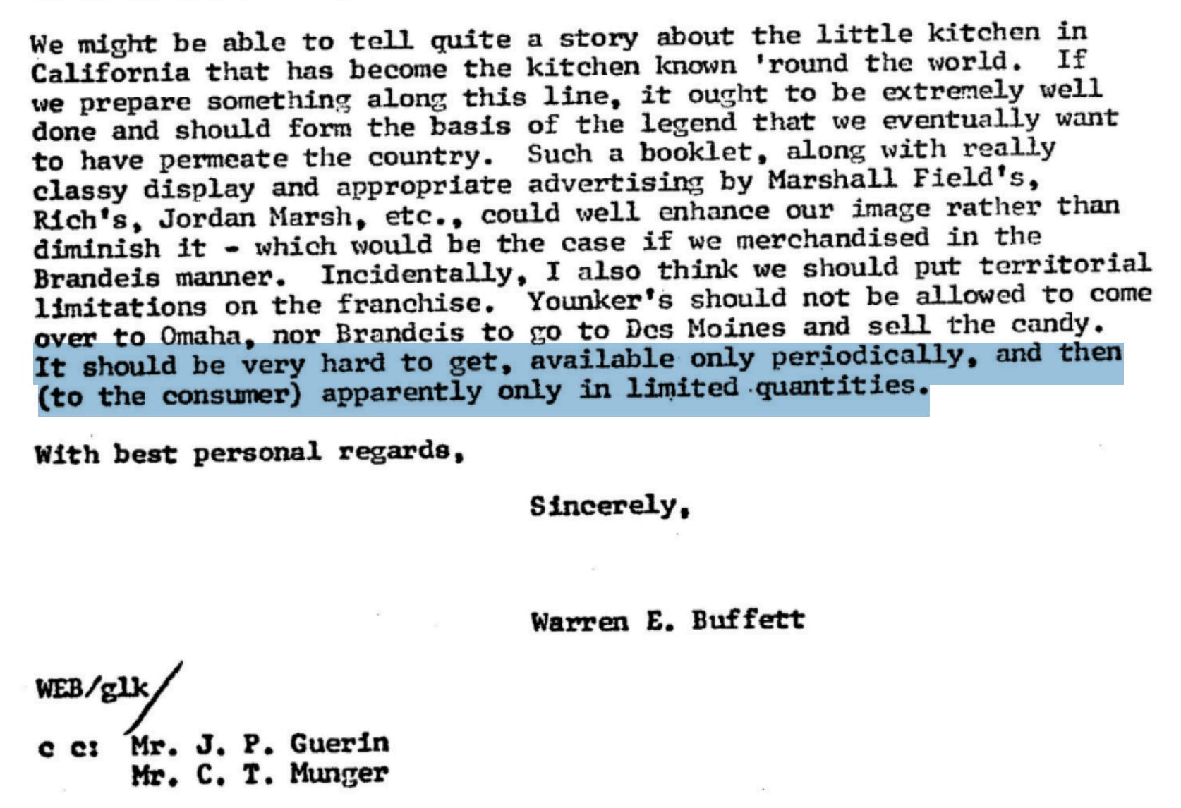 See’s Candy could do that because it felt rare, careful, and human. Everything around it reinforced that perception. Buffett even wrote that it “should be very hard to get, available only periodically, and then apparently only in limited quantities.”
