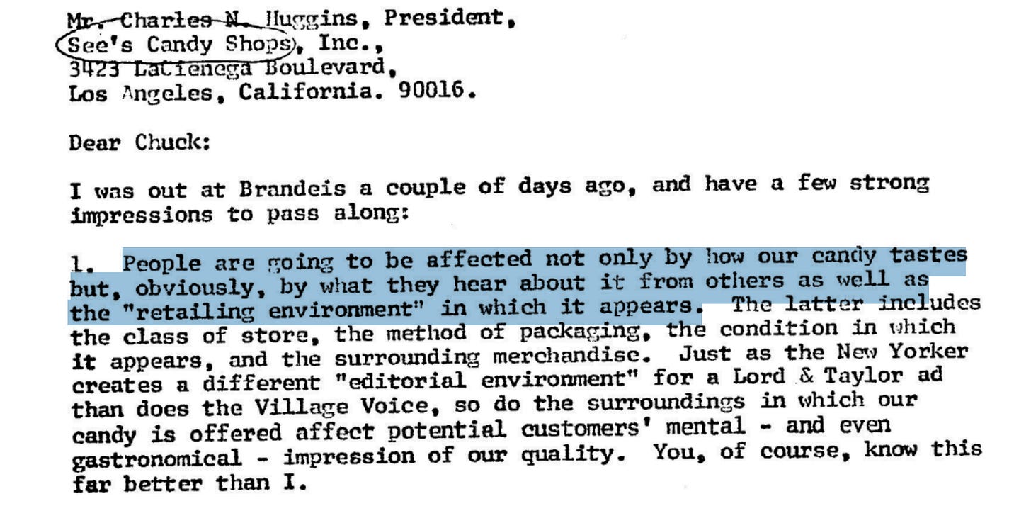 “People are going to be affected not only by how our candy tastes,” Buffett wrote, “but by what they hear about it from others as well as the retailing environment in which it appears.”